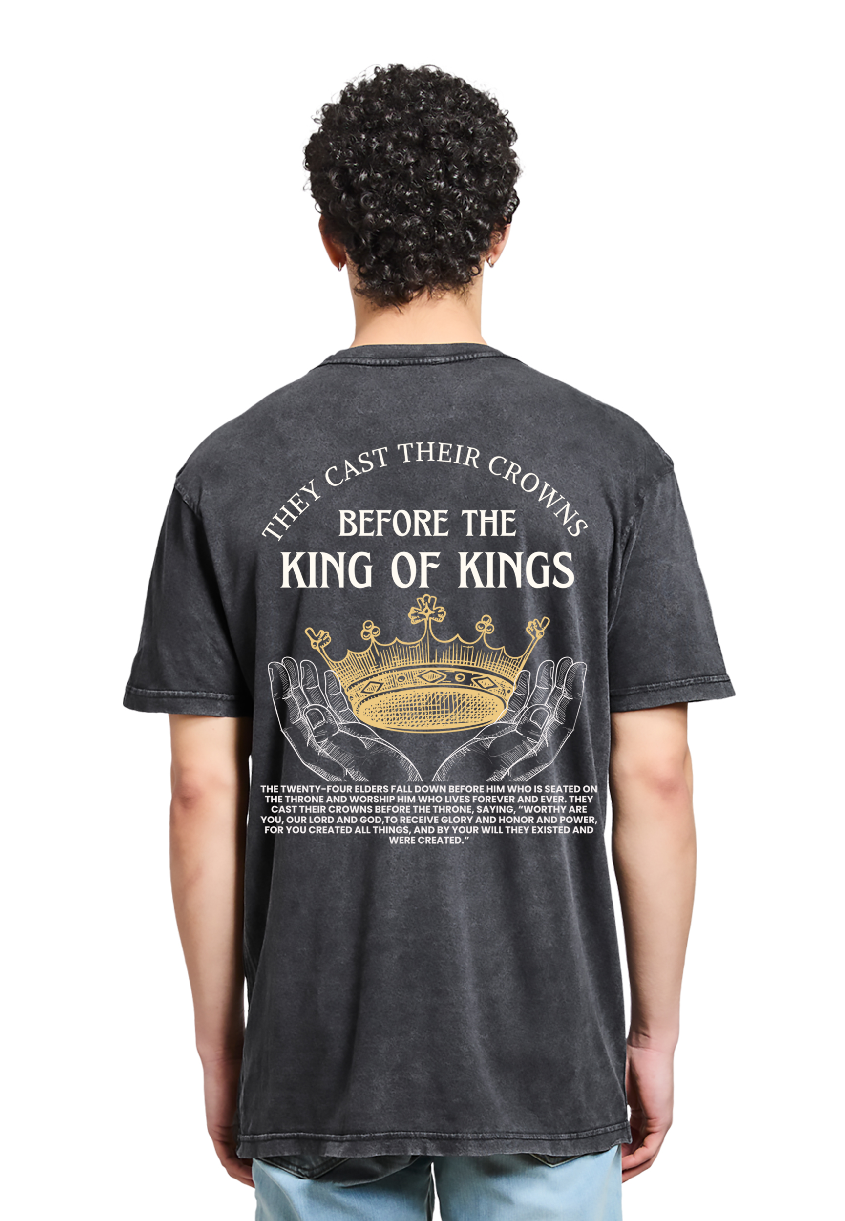 Power laid down. Glory given back. The Crown Caster vintage tee is a visual homage to Revelation 4:10–11 — a moment where even the highest throw down their crowns, recognizing that all honor belongs to something greater. Surrender is the highest honor.